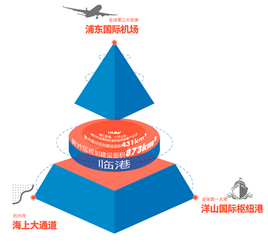 临港新片区位于上海东南角,北临全球第三大空港——浦东国际机场,南接全球集装箱吞吐量第一大港——洋山国际枢纽港。 处于杭州湾“海上大通道”北端,江浙沪沿海大通道中段,是长三角区域重要的独立节点城市。